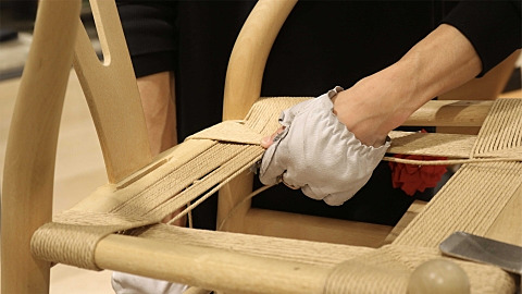Yチェアに欠かせない素材、ペーパーコード。樹脂を染み込ませた紙を縒ったこの素材は、第一次世界大戦中に誕生し、1920年代から椅子に使われるようになりました。均一な品質、しなやかさ、そして耐久性。見た目の美しさだけでなく、長時間座っても疲れにくい快適さが、北欧家具で長く愛されてきた理由です。実際に編まれていく様子を見ることで、一本一本のコードが、確かな張りと緊張感をもって座面を形づくっていることがよく分かります。