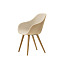 後方に少し傾いた座面に腰を掛けると、身体がすっぽりと包み込まれるような心地よさ。高い背もたれと、程よい高さのアームは姿勢をそっとサポートし、長く座っていても疲れにくい設計です。腰のあたりに空いた丸い穴や斜めに踏ん張る4本脚がどこか愛らしく、空間をやわらかい雰囲気へ導くアイコニックな存在となりそうです。