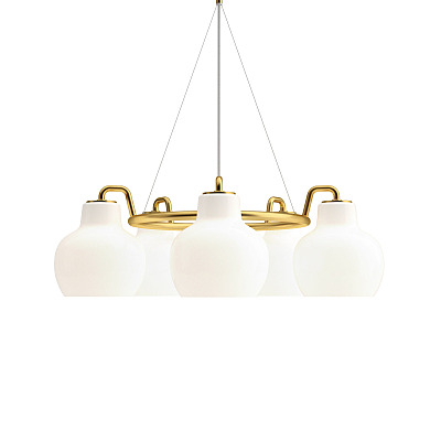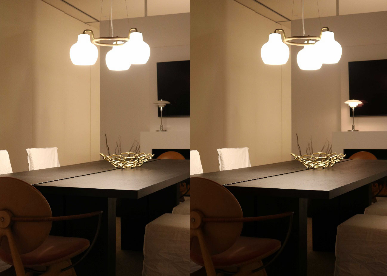 「VL リングクラウン」の3灯ペンダントを主役に据えたダイニング。奥に置かれた「PH ½ ポータブル」の灯りが加わることで、空間の印象が大きく変わるのがわかります。