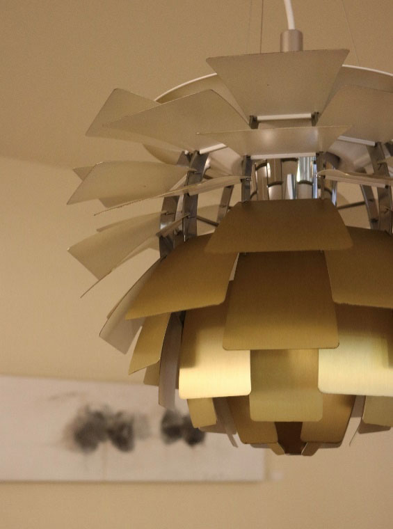 美術品のような存在感を放つ、真鍮製の「PH アーティチョーク」が迎えるリビング空間。光源を取り囲む72枚のシェードの製作は、ルイスポールセンの職人たちの間でも憧れの作業とされています。いつかはアーティチョークのシェードを作るんだと夢見る職人も少なくないとか。
