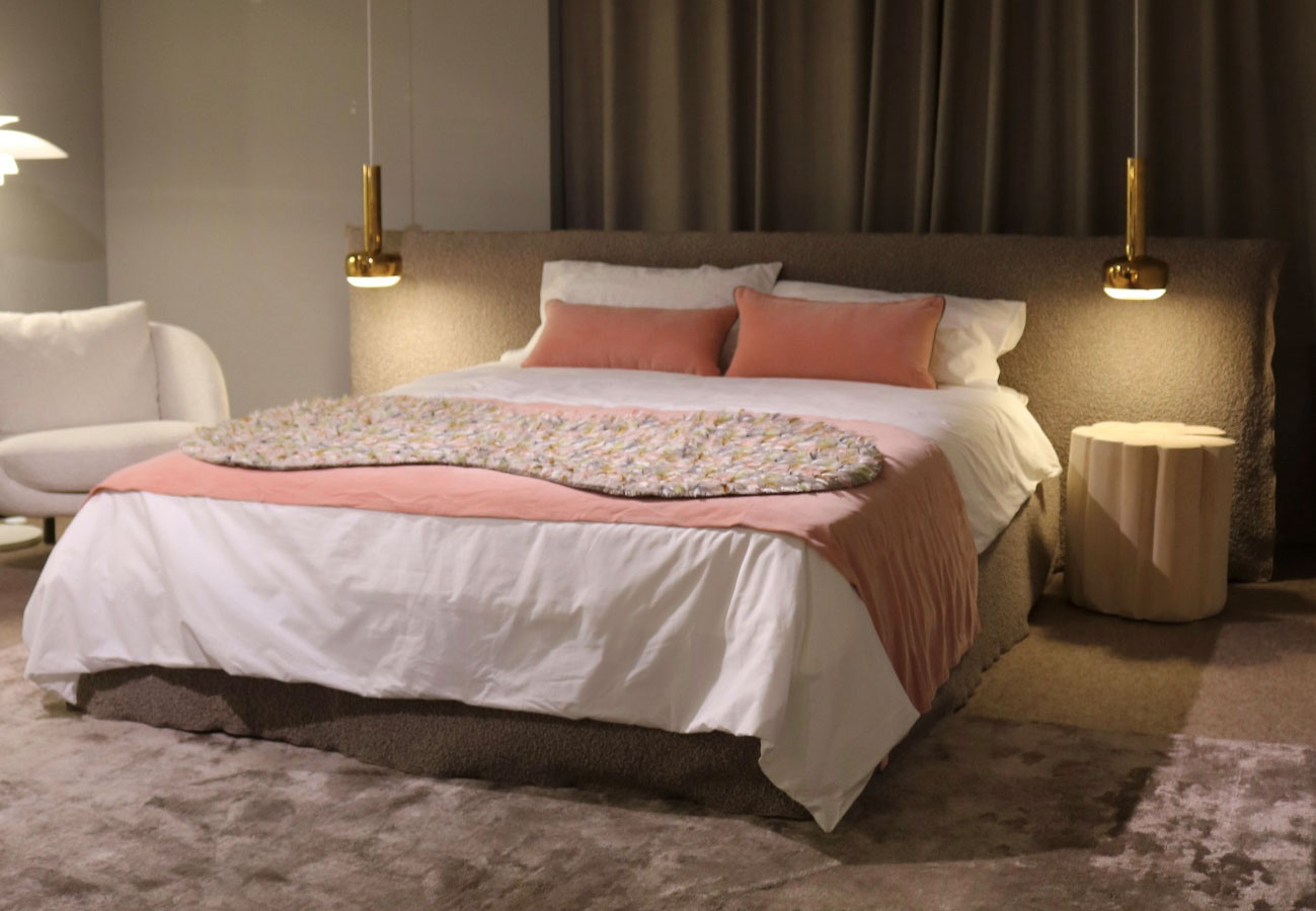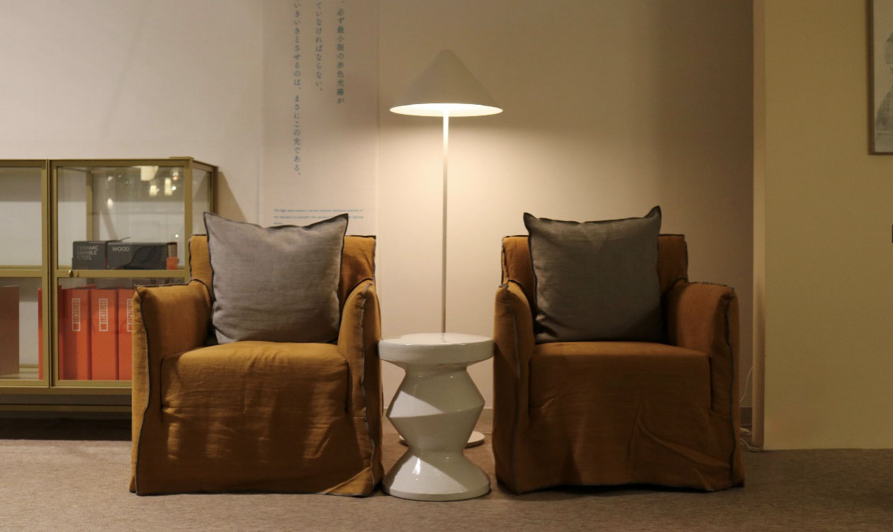 ミニリビングコーナーでは、透過しないシェードが光を柔らかく下方向へと導き、温かく親密な雰囲気を生み出していました。壁近くに配置された「カイレン」フロアランプは壁面をやさしく照らし、ランプ単体以上の広がりのある明るさを空間にもたらします。
