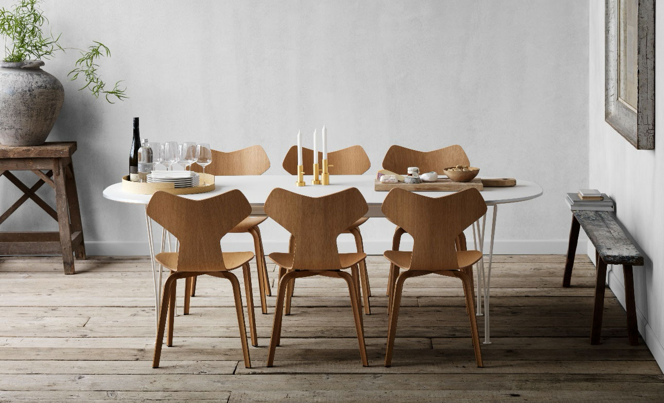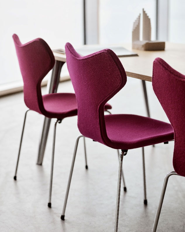 「アントチェア」や「セブンチェア」が持つ軽快さやスタッキングの利便性とは異なり、より重厚で印象的なデザインを特徴としているグランプリチェア。アートピースのような存在感と機能美を兼ね備え、住宅では上質なダイニングやリビングに自然に調和し、オフィスやカフェでは空間の格を高めるアクセントとなります。