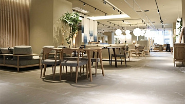 広々とした展示空間の中で、ANIMASサイドチェアの滑らかな曲線と木肌の美しさは自然と目を惹きます。座面は体のラインに沿った立体設計で、自然なフィット感を実感。一見シンプルながら座り心地にもこだわったデザインが感じられました。