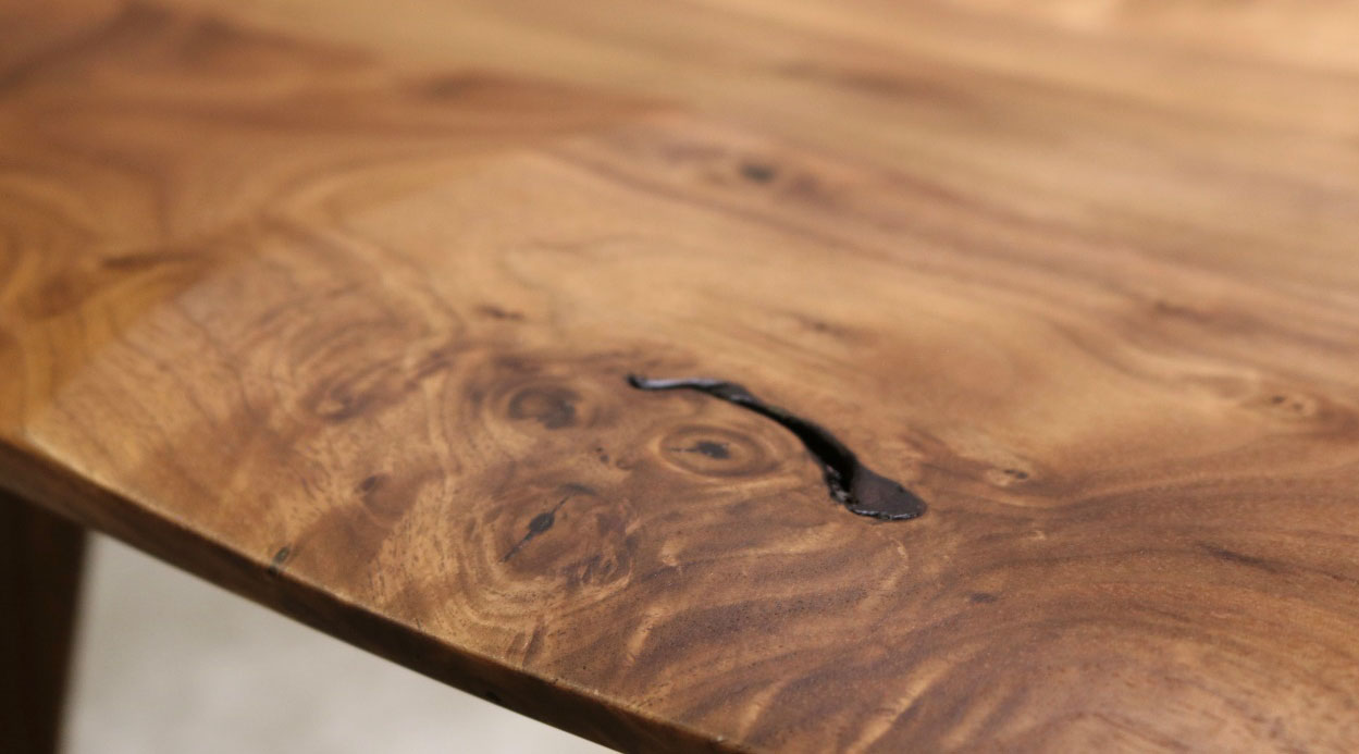 ANIMASサイドチェアは、木目や節などの木が本来持つ自然な表情をそのまま活かし、素材本来の美しさを引き立てています。その中でも節の穴は、より木の個性を感じられる部分。表面の仕上げは、通常加工(角を丸め樹脂で表面をコーティング)、フラット加工(樹脂による平らな穴埋め)から選択できます。