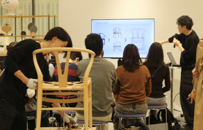 会場でひときわ注目を集めていたのが、カール・ハンセン&サンジャパンの職人によるペーパーコード編みのデモンストレーション。日本にわずか4人しかいない職人の手仕事を、間近で見られる貴重な機会です。トークと並行して進む編みの工程を、参加者の皆さまは食い入るように見守り、途中には実際に座面編みを体験する時間も。「見る」「聞く」だけでなく、「触れる」「感じる」ことで、Yチェアの価値がより立体的に伝わるひとときとなりました。