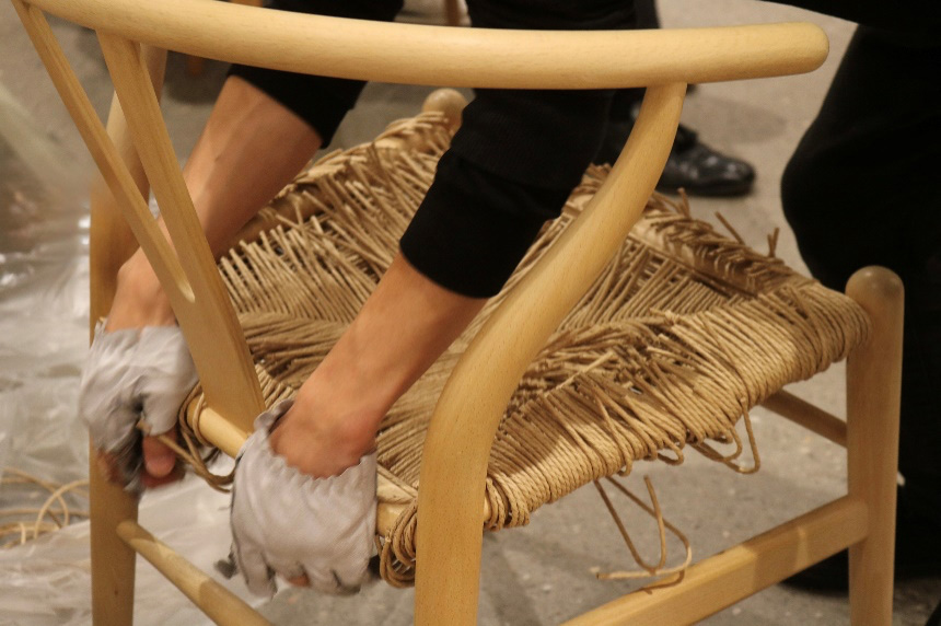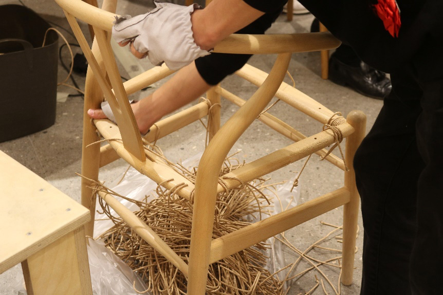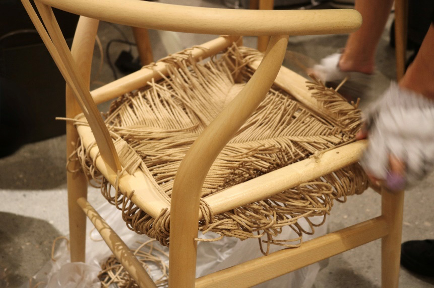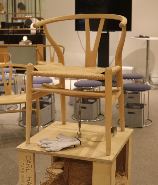午前の部では、デモンストレーションによって90分間で一脚のYチェアが完成。編みたての座面は、驚くほどパンッとした張りがあり、凛とした佇まいを見せていました。