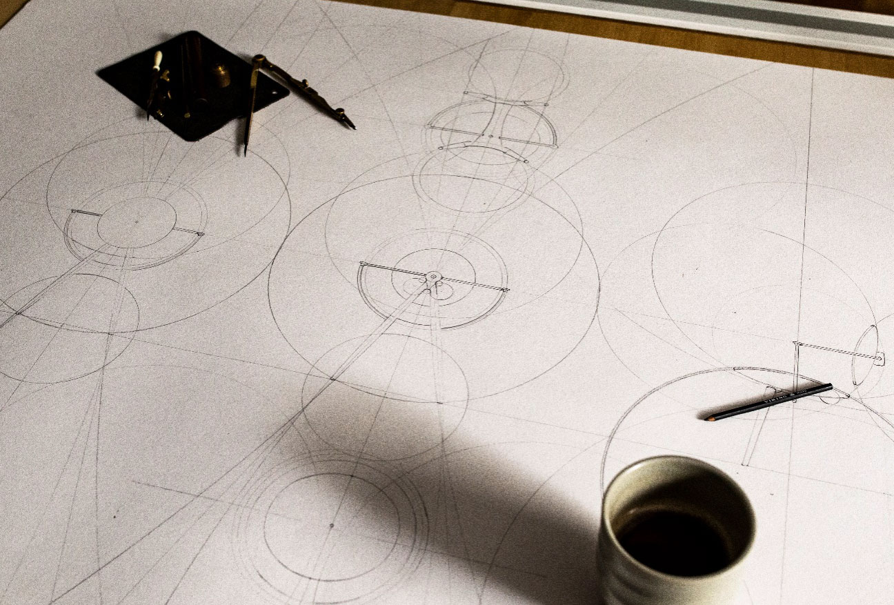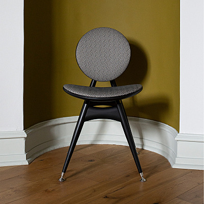 背もたれから後脚へとつながるAフレーム構造は、コンパスから着想を得たもの。背もたれの円形メタルパーツの中心から円形を組み合わせることで描き出されました。