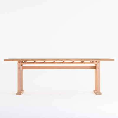 秋田杉を贅沢に用いたテーブルは、社寺仏閣などの建築に見られるような釘やビスを使わない木組みの構造が特徴です。無垢材ならではの豊かな木目と量感が、空間に確かな重心を生み出しています。