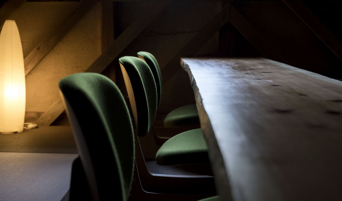 低く構えるフォルムは、重厚な蔵の空間に自然に溶け込み、座る人に安らぎをもたらします。