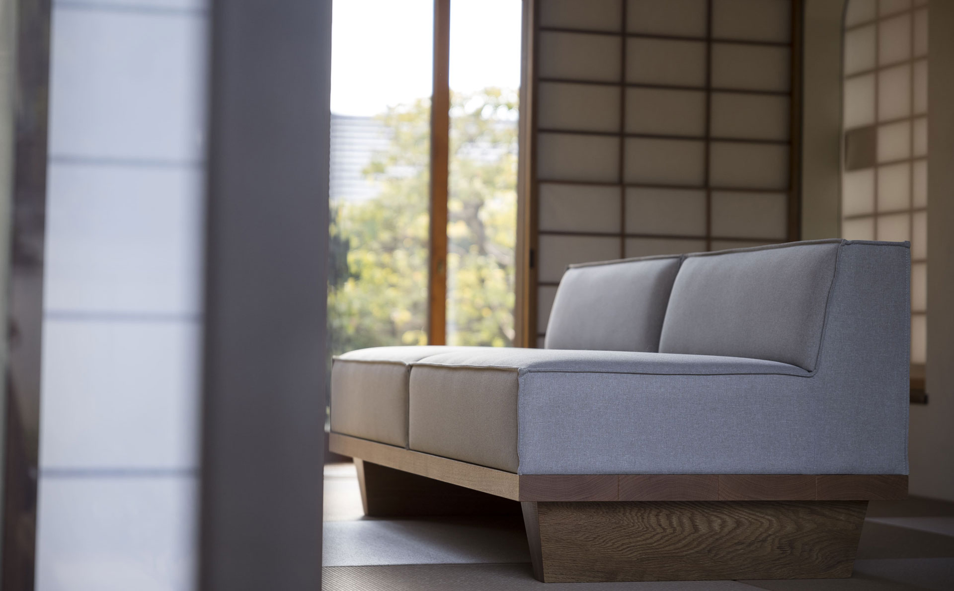 琉球畳が敷かれた一室に凛と佇むのは、è interiors の「P ソファ」。永山祐子氏によってデザインされた、畳の上でも美しく成立する一台です。畳を痛めにくい“畳摺りの脚”を備え、和の空間に自然に溶け込む設計。無駄を削ぎ落とした端正なフォルムは琉球畳と響き合い、この部屋ならではの奥行きと静かな洗練をもたらしています。