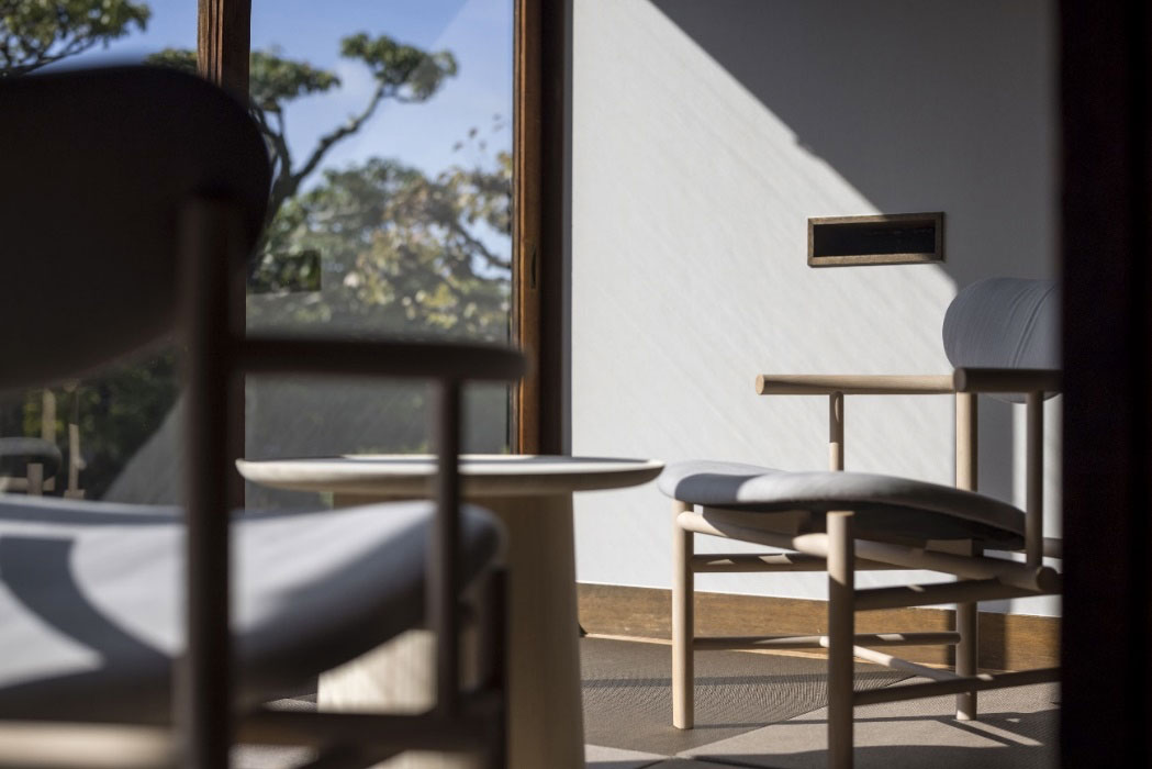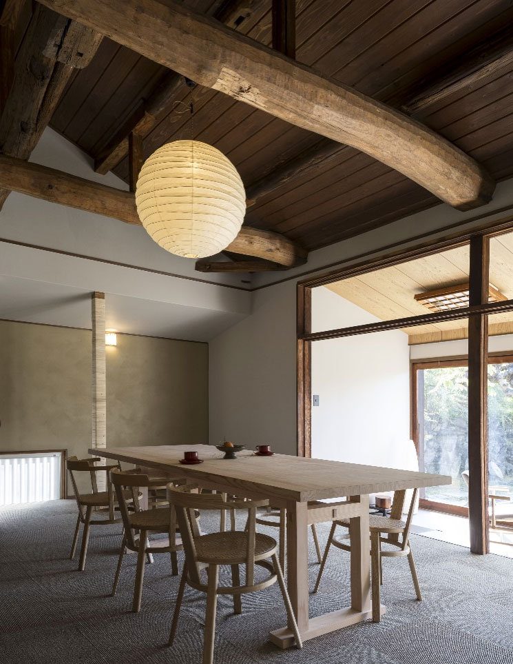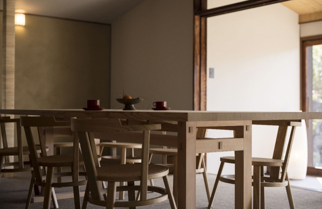 建築に刻まれた記憶や素材の風合いを尊重し、「間」や「余白」を生かした空間設計。その上に、日本の伝統美が感じられる家具を重ねることで、建築と家具が互いに響き合う設えが実現しました。